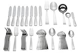 8 place settings and 1 service set. Each place setting consists of: dinner knife; dinner fork; salad fork; place spoon; teaspoon. Service set consists of: serving spoon; serving fork; gravy ladle; butter spreader; sugar spoon. 45 pieces total.